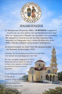 Η Αδελφότητα Ολυμπιτών Ρόδου «Η ΒΡΥΚΟΥΣ» ενημερώνει τα μέλη της και τους φίλους που εκκλησιάζονται στον Ιερό Ναό του Αρχαγγέλου Μιχαήλ στα Ασγούρου, ότι η εκκλησία θα παραμείνει κλειστή έως και την Πρωτοχρονιά, λόγω απουσίας του Εφημερίου.