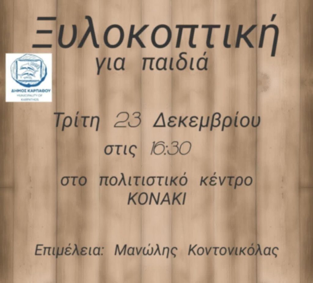 52 ViewsΞυλοκοπτική για παιδιά την Τρίτη 23 Δεκεμβρίου ,Ο Δήμος Καρπάθου σας προσκαλεί σε μια δημιουργική δράση Ξυλοκοπτικής για παιδιά την Τρίτη 23 Δεκεμβρίου και ώρα 16:30 στο Πολιτιστικό Κέντρο- ΚΟΝΑΚΙ. Τα παιδιά θα έχουν την ευκαιρία να γνωρίσουν την τέχνη της ξυλοκοπτικής και να δημιουργήσουν ! Επιμέλεια: Μανώλης Κοντονικόλας Σας περιμένουμε όλους!☺️ Η εντεταλμένη […]